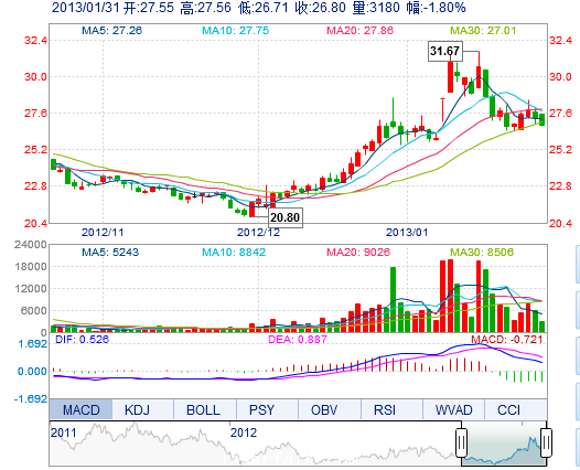 | 今 開: | 27.55 | 成交量: | 3180手 | 振 幅: | 3.11% |
