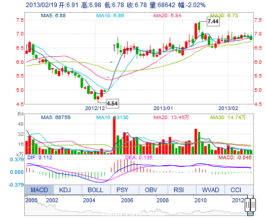 今開: 6.91 成交量: 6.86萬手 振幅: 2.89% 最高: 6.98 成交額: 4708.89萬元 換手率: 1.57% 最低: 6.78 總市值: 29.62億 市凈率: 2.20 昨收: 6.92 流通市值: ...