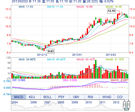 今開: 11.36 成交量: 28.32萬手 振幅: 3.19% 最高: 11.55 成交額: 3.23億元 換手率: 2.99% 最低: 11.19 總市值: 116.97億 市凈率: 3.61 昨收: 11.27 流通市值...