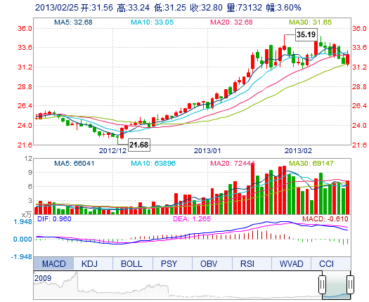 今開: 31.56 成交量: 7.31萬手 振幅: 6.29% 最高: 33.24 成交額: 2.38億元 換手率: 2.65% 最低: 31.25 總市值: 97.63億 市凈率: 7.49 昨收: 31.66 流通市值:...