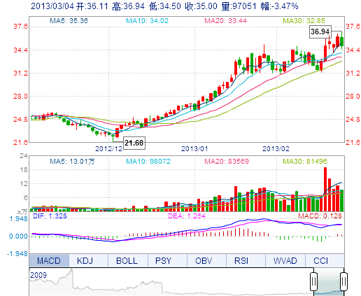 | 最 高: | 36.94 | 成交額: | 3.46億元 | 換手率: | 3.52% |
