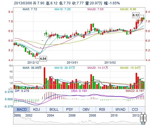 今開: 7.90 成交量: 20.97萬手 振幅: 5.32% 最高: 8.12 成交額: 1.64億元 換手率: 4.80% 最低: 7.70 總市值: 33.94億 市凈率: 2.52 昨收: 7.90 流通市值: 33...