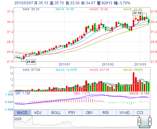 | 今 開(kāi): | 35.13 | 成交量: | 9.29萬(wàn)手 | 振 幅: | 6.78% |