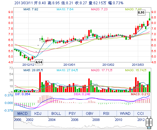 今開: 8.40 成交量: 62.15萬手 振幅: 9.01% 最高: 8.95 成交額: 5.29億元 換手率: 14.23% 最低: 8.21 總市值: 36.12億 市凈率: 2.68 昨收: 8.21 流通市值: 3...
