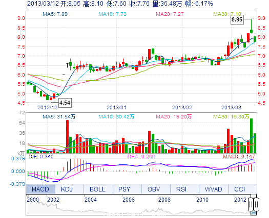 | 今 開: | 8.05 | 成交量: | 36.48萬(wàn)手 | 振 幅: | 6.05% |