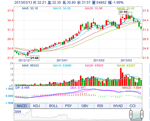 | 今 開: | 32.21 | 成交量: | 6.49萬手 | 振 幅: | 4.81% |