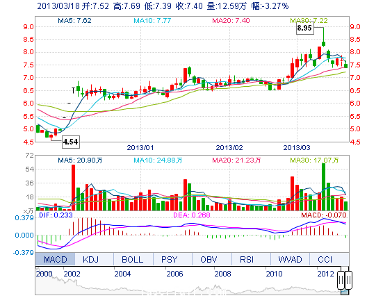 | 今 開: | 7.52 | 成交量: | 12.59萬手 | 振 幅: | 3.92% |