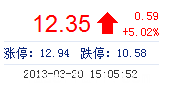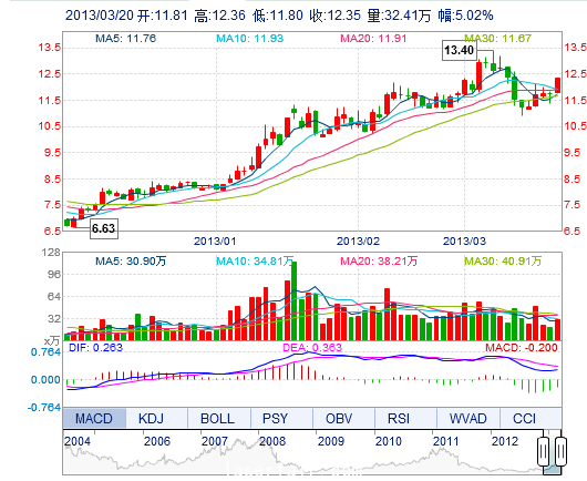 今 開: 11.81 成交量: 32.41萬手 振 幅: 4.76% 最 高: 12.36 成交額: 3.92億元 換手率: 3.43% 最 低: 11.80 總市值: 128.98億 市凈率: 3.98 昨 收: 11.76 流...