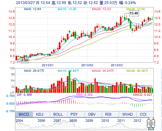 | 今 開: | 12.64 | 成交量: | 25.03萬手 | 振 幅: | 3.72% |