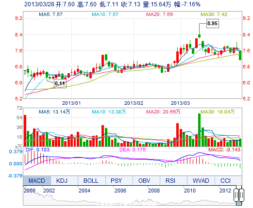 | 今 開: | 7.60 | 成交量: | 15.64萬手 | 振 幅: | 6.38% |