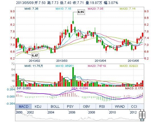 今開: 7.50 成交量: 19.87萬(wàn)手 振幅: 4.41% 最高: 7.73 成交額: 1.51億元 換手率: 4.55% 最低: 7.40 總市值: 33.68億 市凈率: 2.40 昨收: 7.48 流通市值: 33...