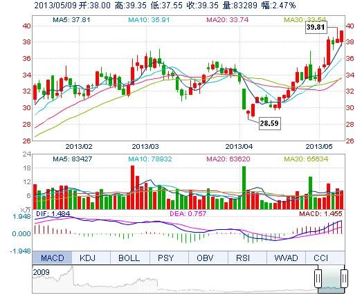 今開: 38.00 成交量: 8.33萬手 振幅: 4.69% 最高: 39.35 成交額: 3.20億元 換手率: 2.90% 最低: 37.55 總市值: 117.13億 市凈率: 8.19 昨收: 38.40 流通市值...