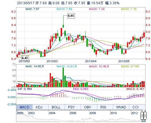 今開: 7.69 成交量: 18.54萬手 振幅: 5.59% 最高: 8.08 成交額: 1.47億元 換手率: 4.25% 最低: 7.65 總市值: 34.73億 市凈率: 2.48 昨收: 7.69 流通市值: 34...