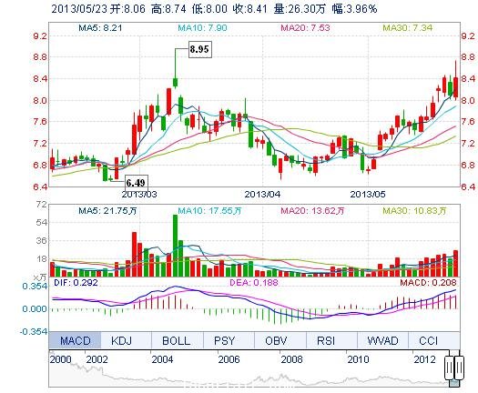 今開: 8.06 成交量: 26.30萬手 振幅: 9.15% 最高: 8.74 成交額: 2.22億元 換手率: 6.02% 最低: 8.00 總市值: 36.73億 市凈率: 2.62 昨收: 8.09 流通市值: 36...