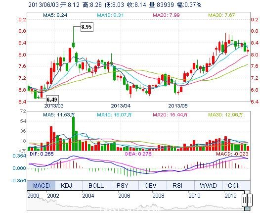 今開: 8.12 成交量: 8.39萬手 振幅: 2.84% 最高: 8.26 成交額: 6835.30萬元 換手率: 1.92% 最低: 8.03 總市值: 35.56億 市凈率: 2.54 昨收: 8.11 流通市值: ...