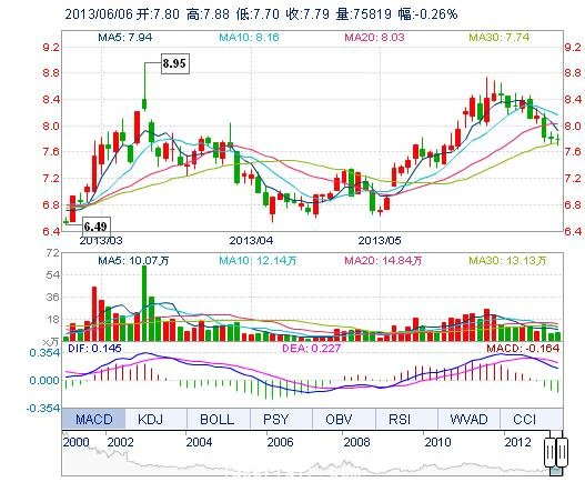 今開: 7.80 成交量: 7.58萬(wàn)手 振幅: 2.30% 最高: 7.88 成交額: 5897.52萬(wàn)元 換手率: 1.74% 最低: 7.70 總市值: 34.03億 市凈率: 2.43 昨收: 7.81 流通市值: ...