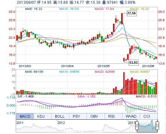 | 今 開: | 14.95 | 成交量: | 9.79萬手 | 振 幅: | 6.15% |