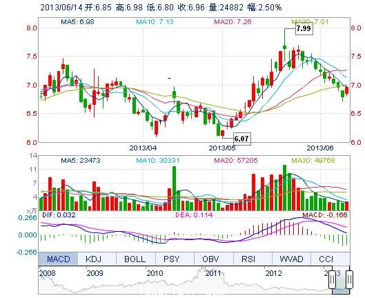| 今 開: | 6.85 | 成交量: | 2.49萬手 | 振 幅: | 2.65% |