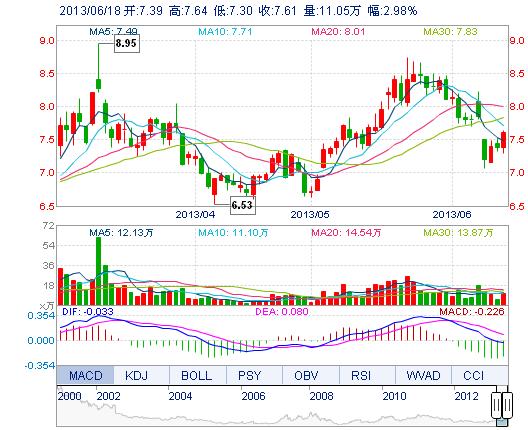 今開: 7.39 成交量: 11.05萬手 振幅: 4.60% 最高: 7.64 成交額: 8271.31萬元 換手率: 2.53% 最低: 7.30 總市值: 33.24億 市凈率: 2.37 昨收: 7.39 流通市值:...