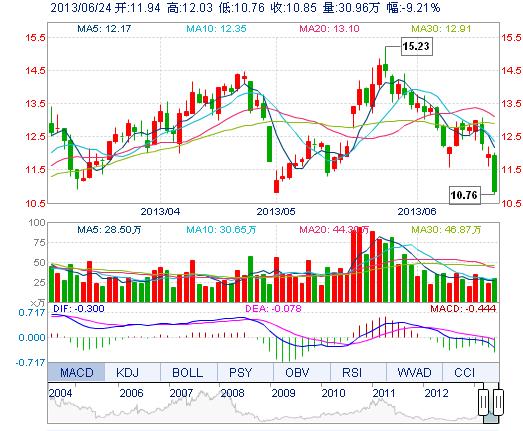 今開: 11.94 成交量: 30.96萬手 振幅: 10.63% 最高: 12.03 成交額: 3.50億元 換手率: 3.28% 最低: 10.76 總市值: 113.32億 市凈率: 3.27 昨收: 11.95 流通市...