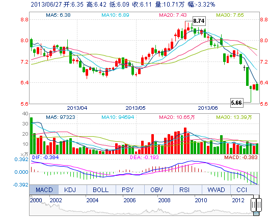 今  開(kāi): 6.35 成交量: 10.71萬(wàn)手 振  幅: 5.22%