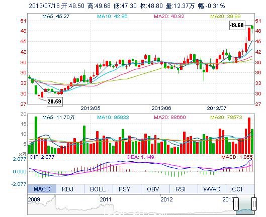 | 最 高: | 49.68 | 成交額: | 5.99億元 | 換手率: | 4.31% |