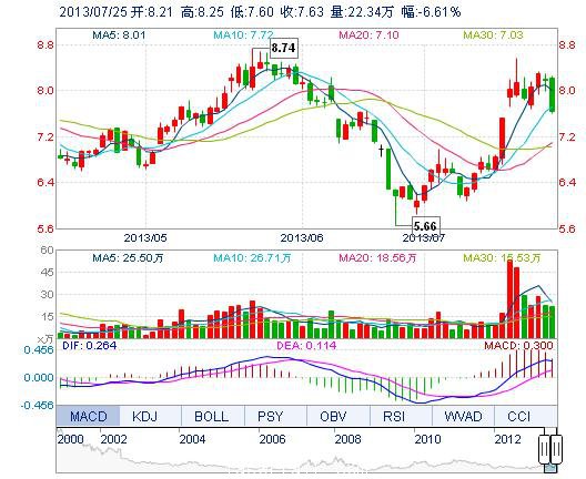 今開: 8.21 成交量: 22.34萬手 振幅: 7.96% 最高: 8.25 成交額: 1.76億元 換手率: 5.11% 最低: 7.60 總市值: 33.33億 市凈率: 2.38 昨收: 8.17 流通市值: 33...