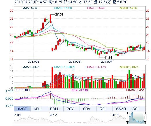 今開: 14.57 成交量: 12.54萬手 振幅: 11.85% 最高: 16.25 成交額: 1.98億元 換手率: 18.49% 最低: 14.50 總市值: 20.90億 市凈率: 3.27 昨收: 14.77 流通市...