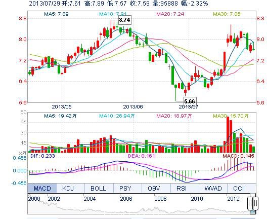 今開(kāi): 7.61 成交量: 9.59萬(wàn)手 振幅: 4.15% 最高: 7.89 成交額: 7409.77萬(wàn)元 換手率: 2.20% 最低: 7.57 總市值: 33.15億 市凈率: 2.37 昨收: 7.72 流通市值: ...