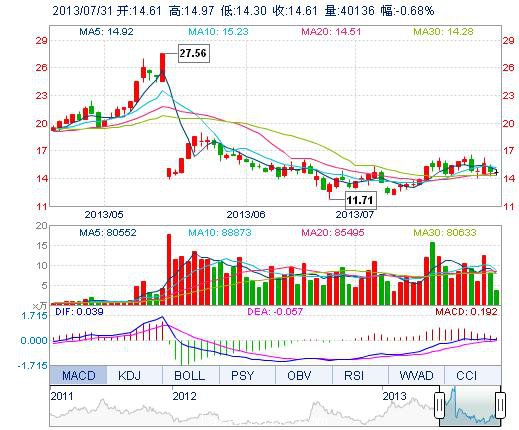 今開: 14.61 成交量: 4.01萬手 振幅: 4.55% 最高: 14.97 成交額: 5883.70萬元 換手率: 5.92% 最低: 14.30 總市值: 19.58億 市凈率: 3.06 昨收: 14.71 流通市...