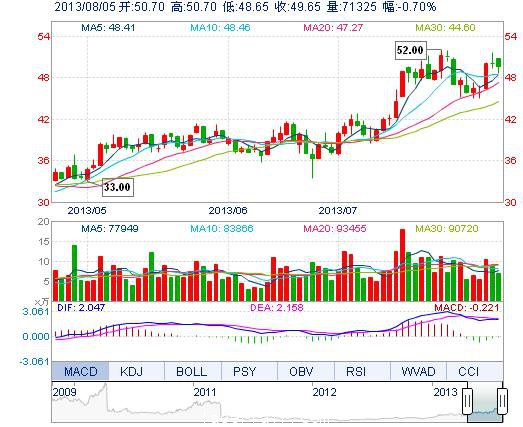 今開: 50.70 成交量: 7.13萬手 振幅: 4.10% 最高: 50.70 成交額: 3.52億元 換手率: 2.48% 最低: 48.65 總市值: 147.79億 市凈率: 9.90 昨收: 50.00 流通市值...