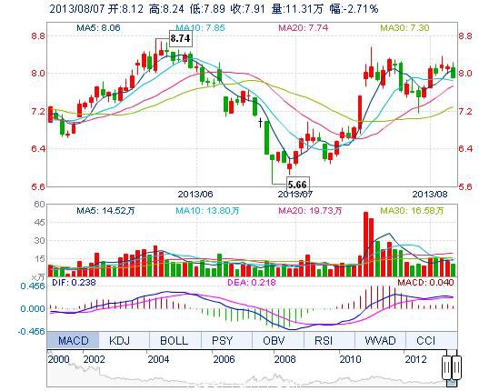 今開: 8.12 成交量: 11.31萬手 振幅: 4.31% 最高: 8.24 成交額: 9083.14萬元 換手率: 2.59% 最低: 7.89 總市值: 34.55億 市凈率: 2.47 昨收: 8.13 流通市值:...
