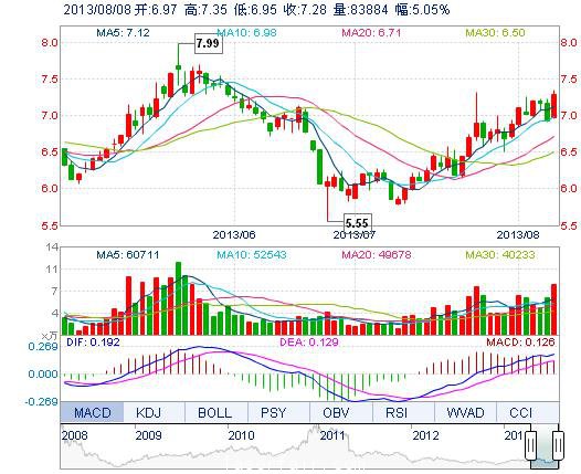 今開: 6.97 成交量: 8.39萬手 振幅: 5.77% 最高: 7.35 成交額: 6033.53萬元 換手率: 3.05% 最低: 6.95 總市值: 20.75億 市凈率: 3.30 昨收: 6.93 流通市值: ...