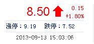 今開: 8.26 成交量: 18.33萬手 振幅: 4.07% 最高: 8.51 成交額: 1.53億元 換手率: 4.20% 最低: 8.17 總市值: 37.13億 市凈率: 2.65 昨收: 8.35 流通市值: 37...