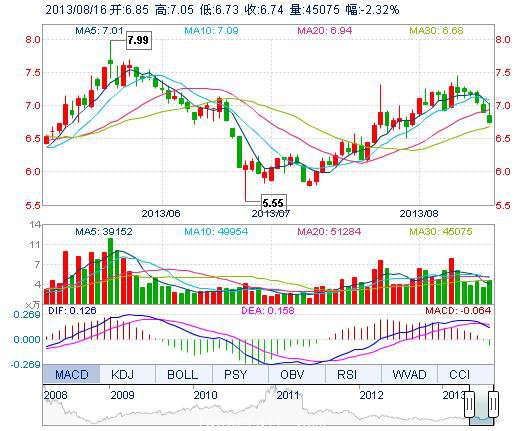 今開: 6.85 成交量: 4.51萬(wàn)手 振幅: 4.64% 最高: 7.05 成交額: 3099.25萬(wàn)元 換手率: 1.64% 最低: 6.73 總市值: 19.21億 市凈率: 3.05 昨收: 6.90 流通市值: ...