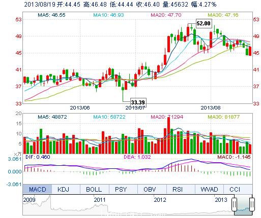 今開: 44.45 成交量: 4.56萬手 振幅: 4.58% 最高: 46.48 成交額: 2.08億元 換手率: 1.59% 最低: 44.44 總市值: 138.11億 市凈率: 9.25 昨收: 44.50 流通市值...