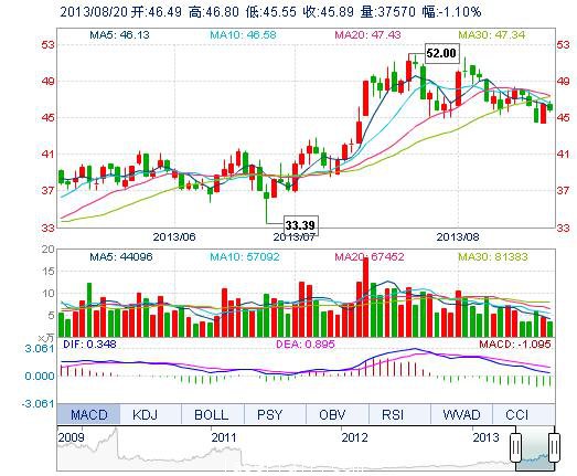 今開: 46.49 成交量: 3.76萬手 振幅: 2.69% 最高: 46.80 成交額: 1.73億元 換手率: 1.31% 最低: 45.55 總市值: 136.60億 市凈率: 9.15 昨收: 46.40 流通市值...