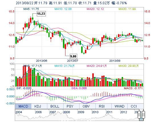 今開: 11.79 成交量: 15.02萬手 振幅: 1.78% 最高: 11.91 成交額: 1.77億元 換手率: 1.59% 最低: 11.70 總市值: 122.30億 市凈率: 3.53 昨收: 11.80 流通市值...
