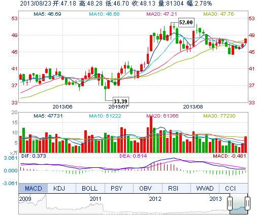 今開: 47.18 成交量: 8.13萬手 振幅: 3.37% 最高: 48.28 成交額: 3.87億元 換手率: 2.83% 最低: 46.70 總市值: 143.26億 市凈率: 9.60 昨收: 46.83 流通市值...
