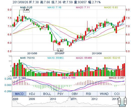 | 最 高: | 7.66 | 成交額: | 7083.72萬(wàn)元 | 換手率: | 3.41% |