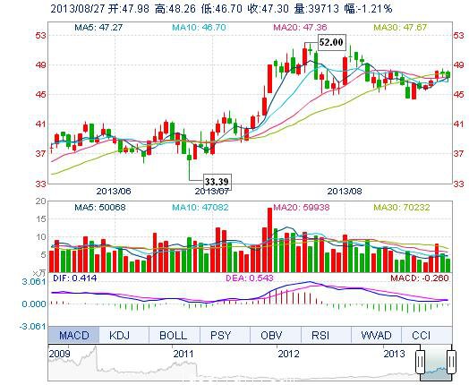 今開: 47.98 成交量: 3.97萬(wàn)手 振幅: 3.26% 最高: 48.26 成交額: 1.88億元 換手率: 1.38% 最低: 46.70 總市值: 140.79億 市凈率: 9.43 昨收: 47.88 流通市值...