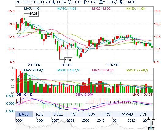 今開: 11.40 成交量: 16.81萬手 振幅: 3.24% 最高: 11.54 成交額: 1.90億元 換手率: 1.78% 最低: 11.17 總市值: 117.29億 市凈率: 3.50 昨收: 11.42 流通市值...