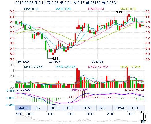 今開: 8.14 成交量: 9.62萬手 振幅: 2.70% 最高: 8.26 成交額: 7828.74萬元 換手率: 2.20% 最低: 8.04 總市值: 35.69億 市凈率: 2.54 昨收: 8.14 流通市值: ...