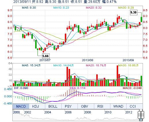 今開: 8.92 成交量: 29.60萬(wàn)手 振幅: 9.33% 最高: 9.30 成交額: 2.59億元 換手率: 6.78% 最低: 8.51 總市值: 37.17億 市凈率: 2.64 昨收: 8.47 流通市值: 37...