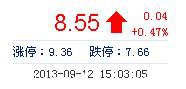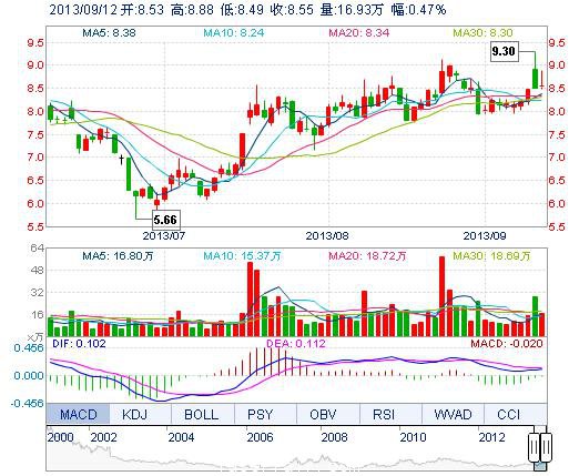 今開: 8.53 成交量: 16.93萬(wàn)手 振幅: 4.58% 最高: 8.88 成交額: 1.47億元 換手率: 3.88% 最低: 8.49 總市值: 37.35億 市凈率: 2.66 昨收: 8.51 流通市值: 37...