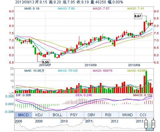 今開: 8.15 成交量: 4.62萬手 振幅: 3.05% 最高: 8.20 成交額: 3729.68萬元 換手率: 1.68% 最低: 7.95 總市值: 23.34億 市凈率: 3.81 昨收: 8.19 流通市值: ...