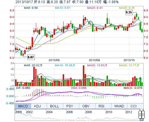 今開: 8.10 成交量: 11.18萬手 振幅: 4.10% 最高: 8.20 成交額: 9004.64萬元 換手率: 2.56% 最低: 7.87 總市值: 34.51億 市凈率: 2.45 昨收: 8.05 流通市值:...