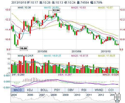 今開: 10.17 成交量: 7.46萬手 振幅: 1.28% 最高: 10.26 成交額: 7616.27萬元 換手率: 0.79% 最低: 10.13 總市值: 106.95億 市凈率: 3.19 昨收: 10.16 流通市...