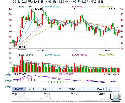 今開: 43.43 成交量: 4.28萬手 振幅: 3.90% 最高: 44.99 成交額: 1.90億元 換手率: 1.49% 最低: 43.30 總市值: 132.82億 市凈率: 8.90 昨收: 43.38 流通市值...