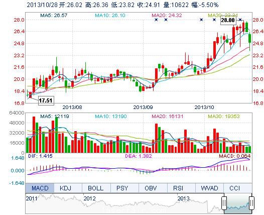 | 最 低: | 23.82 | 總市值: | 17.44億 | 市凈率: | 5.97 |